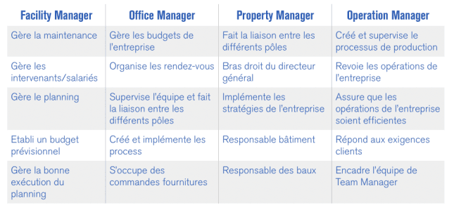 A la fin de cet article retrouvez un tableau comparant le mĂ©tier de Facility Manager Ă dâautres mĂ©tiers de gestionnaire : Property Manager, Office Manager et OpĂ©ration Manager.